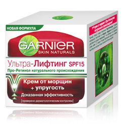 Garnier дневной крем з ефектом ультра — ліфтингу. Ефективно бореться з будь-якими ознаками старіння, усуває навіть глибокі зморшки. Про – ретинол сприяє відновленню пружності шкіри, що забезпечує комплекс лікувальної дії, SPF –фільтри у складі крему оберігають обличчя від впливу ультрафіолетових променів. Середня ціна за упаковку з кремом – близько 400 рублів.