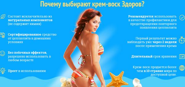 «Здоровий» — це засіб, випускається у формі крему-воску, який допоможе позбутися від целюліту. До складу входять тільки компоненти природного походження, що володіють унікальними властивостями. І такий натуральний ефективний комплекс усуває основні неприємні прояви целюліту (так звана «апельсинова кірка», в’ялість і грубість шкіри), а також повертає шкірним покривом еластичність і пружність і формує ідеальний силует вашого нового стрункого тіла.