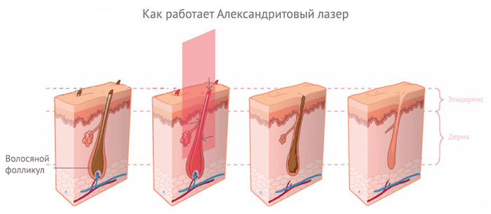 У справі видалення волосся важливо те, що лазерний промінь може вибірково впливати на волосяний покрив, завдяки принципу селективного фототермоліза. Довжина хвилі світлового пучка налаштована таким чином, що руйнівна дія лазерної енергії спрямовується виключно на певні клітини, не надаючи ніякого впливу на інші тканини. У випадку з епіляцією такими клітинами є пігмент меланін, який забарвлює волосся в темний колір.