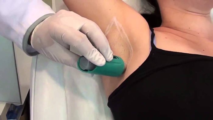 На потові залози впливають спеціальним неодимовим лазером, промінь якого проникає максимально глибоко, з усуненням їх з шкіри. Незважаючи на протимікробні властивості лазера, проводять лікування в стерильному приміщенні, таким чином зводячи нанівець можливість занесення інфекції через оброблювану ділянку шкіри.