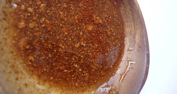 - Склянку меду змішуємо з чотирма столовими ложками кориці, додаємо дві ложки олії оливи і реп’яха, заливаємо теплою водою і ретельно перемішуємо.
