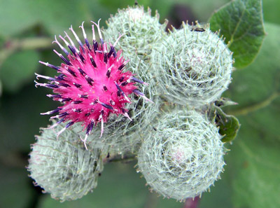 Репейная маска: ложка масла в тандемі з яєчним жовтком, подрібненим часником, 10 г меду. Однорідна маса наноситься на коріння і рівномірно розподіляється по всій довжині пасма. Голову необхідно обгорнути харчовою плівкою і закутати в рушник. Через півгодини масло змивається відваром з кропиви.