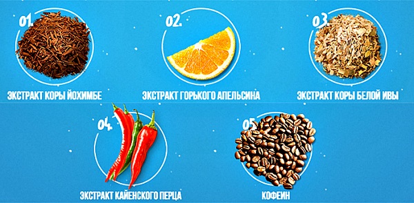 • Екстракт кори йохимбе містить йохімбін, а він не тільки нормалізує обмінні процеси, але і допомагає підтримувати сили, що для схуднення дуже корисно (це доводять відгуки). Таке речовина помітно підвищує рухову активність і додає сили, необхідні для фізичних навантажень.