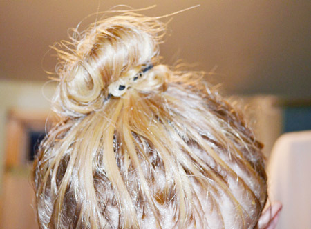Після того, як ви нанесли масу на локони, потрібно закріпити волосся так, щоб вони не вивалювалися і не забруднили ненароком вашу одяг, обличчя і шию. Для цього зробіть невеликий хвостик або скористайтеся шпилькою.