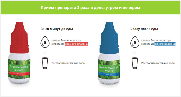 Інструкція по застосуванню має дані про прийом крапель. За двадцять хвилин до їжі потрібно прийняти п’ять крапель з червоного бульбашки, а після їжі – п’ять крапель з синього флакончика. Рідина розчиняється в чистій воді. Мінімальна тривалість курсу – місяць.