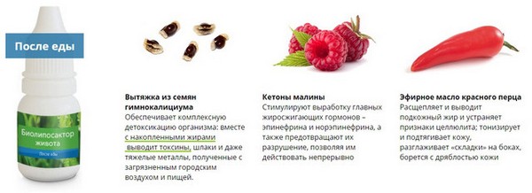 До складу крапель «Биолипосактор живота» входять тільки компоненти природного походження, причому складові двох коштів розрізняються. Препарат, який треба приймати до їди, містить: