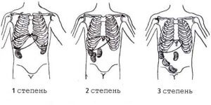 При відсутності терапевтичного медичного лікування у хворого починають розвиватися симптоми більшої інтенсивності. В залежності від стадії нефроптозу клінічна картина ускладнюється. Поступово хворого починають мучити запори, болі в шлунку, нудота, блювота і здуття живота.