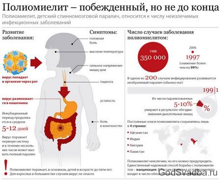 Поліомієліт — вірусне захворювання, що проникають в організм через ротову порожнину. В неї він потрапляє при контакті з будь-якою рідиною з вже зараженого організму.