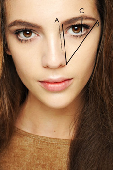 Встановіть точку, в якій йде перетин цієї лінії з надбрівної дуги. Верхню точку брови ви зможете визначити, приклавши до краю носа один кінець ручки, а другий необхідно буде провести вгору повз зіниці. Для визначення зовнішнього краю дуги слід докласти руку до зовнішнього куточка ока від крила носа і позначити третю точку. В кінці потрібно з’єднати всі крапки в одну лінію – це і буде сама правильна форма брів особисто для вас.