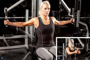 - руки знаходяться на рівні грудей, при цьому в руках повинні бути гантелі по кілограму кожна. Відбуваються розведення рук по сторонам по прямій лінії. При повному розведенні рук необхідно злегка прогинатися розправляючи плечі