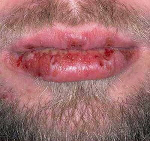 • На слизових рота з’являються освіти у вигляді бульбашок, виразок, еритема, ерозій з нальотом жовтого відтінку. Якщо розкрити такі утворення, то з’являються кровоточиві вогнища, що приносять сильний біль. Губи і ясна набрякають і на них з’являється наліт.