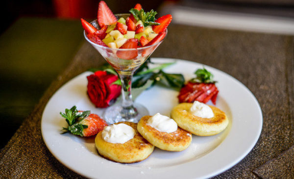 Страви з фруктовими наповненнями більш підійдуть в якості десерту, подавати з йогуртом, свіжими ягодами, морозивом та сиропами.