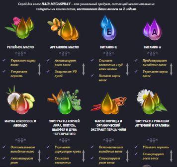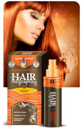 Лікувальний спрей для відновлення волосся Hair MegaSpray глибоко припадає в серцевину і волосяну цибулину. Вхідні в його склад натуральні компоненти активно впливають на структуру волосся по всій довжині і відновлюють зруйновані і мляві фолікули. Спрей широко застосовується для швидкого росту волосся при облисінні, для відновлення локонів після фарбування, для ліквідації лупи. Використовуючи цей інноваційний продукт, можна назавжди позбутися від багатьох проблем зі здоров’ям волосся і шкіри голови.
