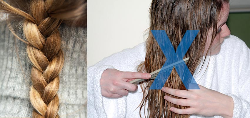 Не лягайте спати з мокрим волоссям, а також не ходіть з розпущеним мокрим волоссям. Додаткове навантаження від отяжелевших волосся несприятливо позначається на міцності з’єднання. З цієї ж причини не розчісуйте мокре волосся. Дайте їм висохнути природним шляхом, і тільки потім розчешіть, поступово збираючи в хвости. На ніч рекомендується заплітати довгі пасма в косу. Спати з розпущеним волоссям категорично не рекомендується.