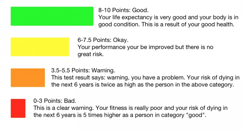 0 — 3 очок: погано. Серйозне попередження. Ти в дуже поганій формі, і ризик померти у наступні 6 років у тебе в 5 разів вище, ніж у людини з категорії «добре».