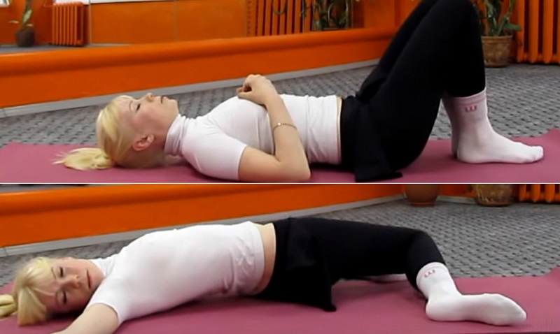Виконуй вправу, лежачи на спині, зігнувши ноги в колінах і притиснувши стегна до живота. Починай виконувати скручування в різні боки, зроби 8 повторень.