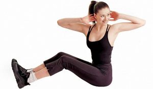 - Лежачи на підлозі, витягніть ноги, руки сцепите в замку під шиєю. Неквапливо сядьте на сідниці і потягніться правим ліктем до лівого коліна. Поверніться в лежаче положення. Повторіть вправу з іншим ліктем.