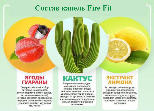 Краплі «Fire fit» — це сучасний ефективний засіб, призначений для зниження ваги, спалювання жиру, виведення надлишків рідини та впорядкування своєї фігури. Продукт повністю натуральний, в нього входять природні екстракти рослин. Рідка форма забезпечує не тільки максимальний комфорт застосування, але і швидкий ефект, адже всі компоненти в короткі терміни досягають мети і починають діяти, і це підтверджують численні відгуки.