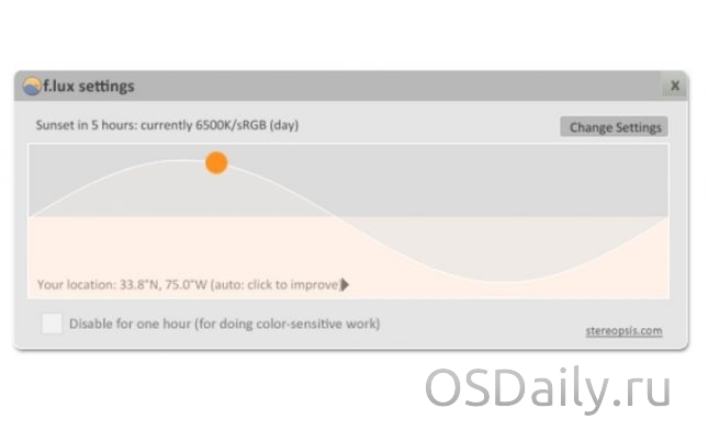 Витріщатися весь день в монітор не дуже корисно для очей. F. lux динамічно змінює кольору екрана в залежності від часу доби. Вдень екран залишається яскравим, але ввечері поступово набуває більш теплий відтінок.