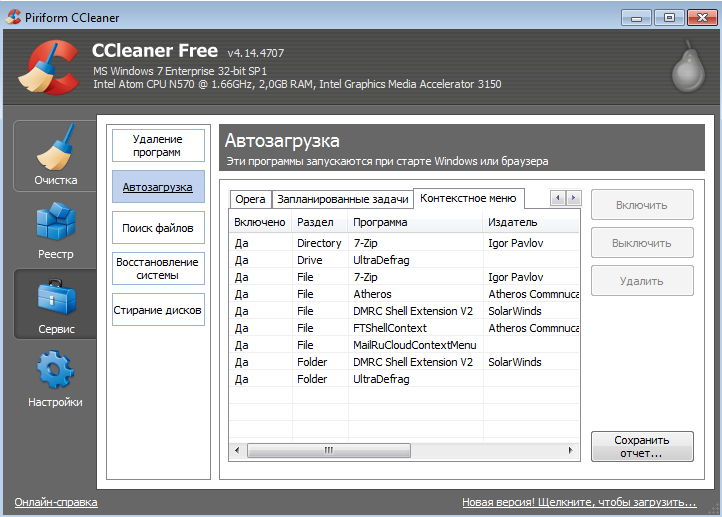 - Після установки програми CCleaner, запускаємо її і переходимо в розділ «Автозавантаження», який можна побачити на панелі зліва.