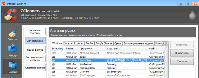 - У кожній вкладці у вікні праворуч видаляємо все, що містить слово baidu або китайські ієрогліфи в полі «Видавець».