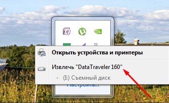 Для того, що б витягти пристрій, необхідно правою кнопкою миші клацнути по значку , а в списку наявних пристроїв вибрати необхідне. Потім з’явиться повідомлення, що пристрій може бути вилучено. Виймайте.