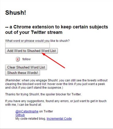 Інтерфейс розширення інтуїтивно зрозумілий і дуже простий. Вам потрібно просто вводити слова або фрази в рядок, а потім наживати кнопку «Add Word To Shushed Word List». Список заблокованих вами фраз або слів буде відображатися відразу ж під кнопкою.