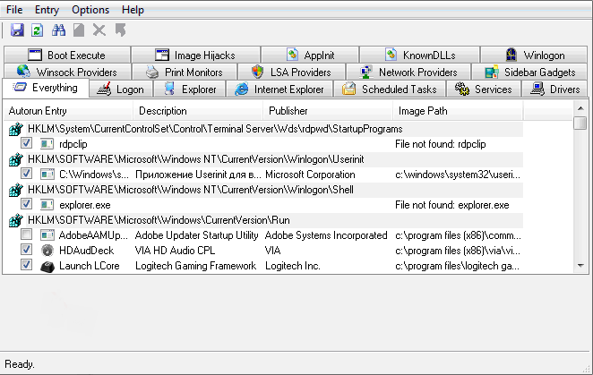 Додатки розкладені по вкладках з інтуїтивно зрозумілими назвами, а все відразу можна побачити у вкладці Everything. Велика частина містяться в автозавантаженні програм знаходиться в Logon. Також корисно буде проінспектувати вкладку Services, щоб прибрати з автозапуску непотрібні служби самої системи.