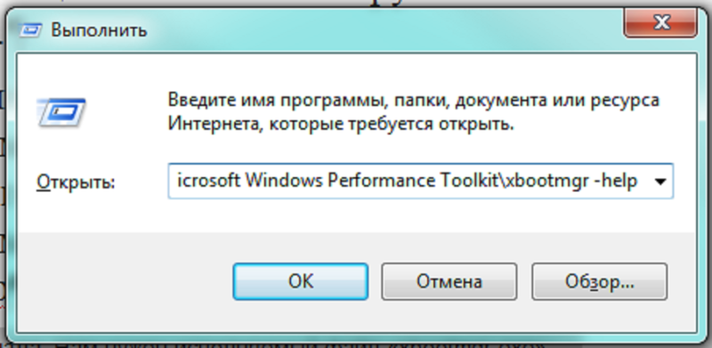 За замовчуванням пакет розпаковується в створюваний каталог C:Program FilesMicrosoft Windows Performance Toolkit. Для роботи використовується командний рядок, в якій набираємо ім’я файлу (включаючи повний шлях) виконуваного модуля і опції його запуску. Наприклад, для виведення довідки у вікні «Виконати» вводимо команду C:Program FilesMicrosoft Windows Performance Toolkitxbootmgr –help