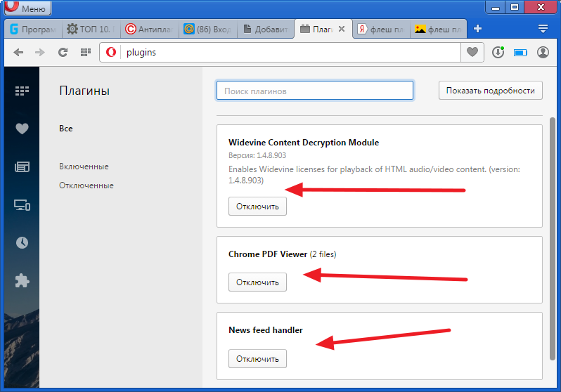 Якщо набрати в адресному рядку браузера Opera opera:plugins», то перед вами буде відкрито вікно зі списком встановлених плагінів. Якщо в списку є Adobe Flash Player і він відключений, його потрібно ввімкнути.