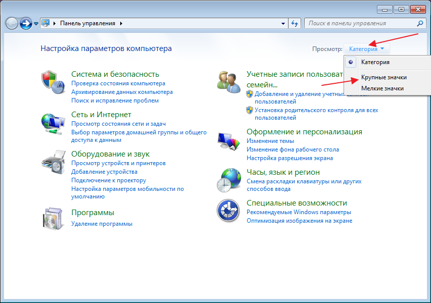 Заходимо в «Панель управління». Виставляємо відображення великих значків.