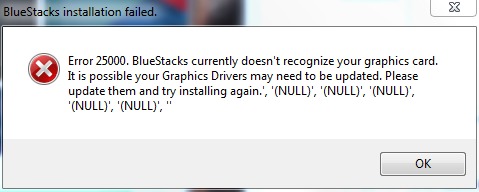 BlueStacks пред’являє досить високі вимоги до відеокарти комп’ютера. Як Лінукс, даний продукт не буде працювати з будь-яким нестандартним обладнанням. Найчастіше при установці програми BlueStacks може видаватися така помилка 25000, що відеокарта не підходить і пропонується оновити драйвера. Причина, швидше за все в тому, що відеокарта у Вас на комп’ютері просто «не тягне» даний емулятор.