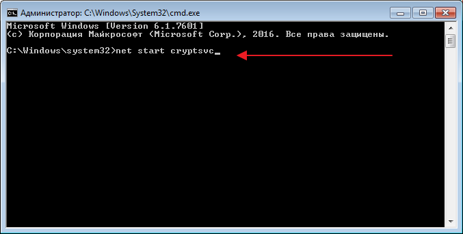 Останньою командою буде «net start cryptsvc» і enter. Після виконаної роботи перегрузим комп’ютер і перевіримо помилку.