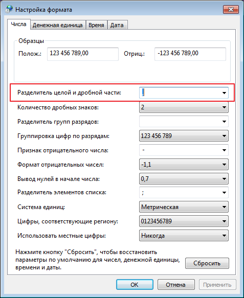 Наступним кроком у розв’язанні проблеми буде перевірка десяткового роздільника. Заходимо в «Панель управління — Мови і регіональні стандарти — Формати — Додаткові параметри». У полі роздільника ви можете бачити різні символи. Замінюємо символ на точку і зберігаємо.