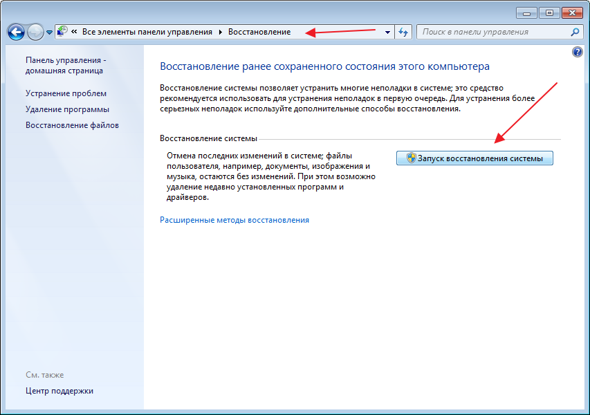 Якщо проблема і досі актуальна, тоді заходимо в «Панель управління — Відновлення системи — Запуск Відновлення системи». Тиснемо «Далее» і вибираємо до якого стану необхідно відкотити систему і починаємо процес.