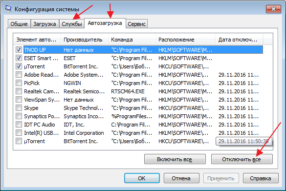 Заходимо в рядок пошуку і вводимо там «msconfig». У вкладках «Автозавантаження» і «Служби» виберемо параметр «Вимкнути все». Натискаємо «Застосувати». Виконаємо чисту завантаження системи і спробуємо оновитися.