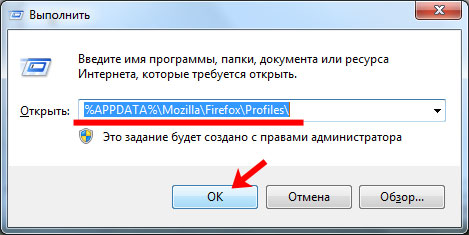 Відкриється віконце «Виконати». В рядок «Відкрити» введіть %APPDATA%MozillaFirefoxProfiles і натисніть «ОК». Після цього відкриється папка Profiles, в якій ви побачите свій профіль.