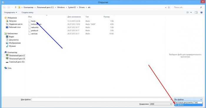Далі знаходимо безпосередньо сам файл хостів по розглянутому раніше шляху. У папці «etc» вибираємо перегляд «Всі файли» і клацаємо двічі на hosts.