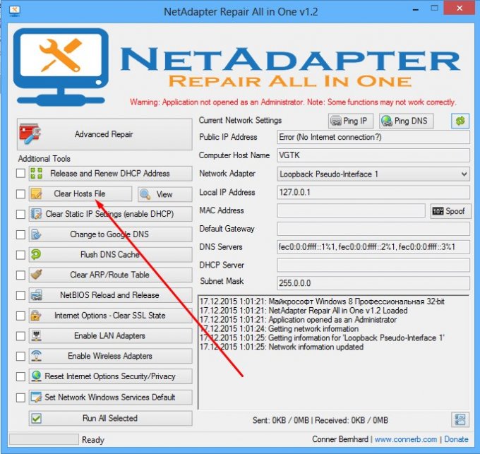 Запустили? Тоді очима знаходимо ліве меню, а в ньому натискаємо на кнопку «Clear Hosts File».