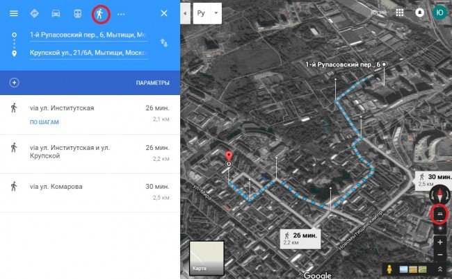 Є можливість зробити проекцію виду, орієнтуючись на вигляд збоку. Маршрут до контрольної точки буде вказуватися не тільки, орієнтуючись на автомобільний транспорт або велосипед, але й замислюючись про переміщення до потрібного пункту – пішим ходом.