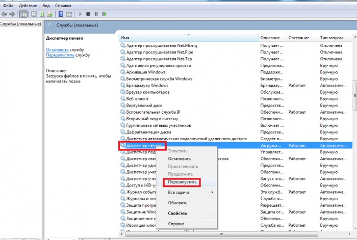 У викликаному меню знайдіть пункт «Диспетчер друку натисніть ПКМ на цей пункт «перезапуск» служби.