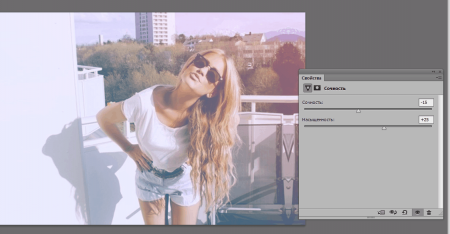 Також застосовуємо коригувальний шар «Вібрація» (або в багатьох версіях Фотошопу «Соковитість») з такими приблизно значеннями, як на зображенні нижче.