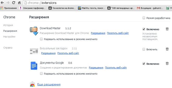 Також можна заблокувати дію раніше встановлених розширень. Для цього потрібно відкрити меню браузера, зайти на останній рядок «Налаштування». Зліва переходимо в розділ «Розширення». Відкриється сторінка, на якій будуть всі ваші розширення і додатково до них посилання з діями – «Дозволу» і «Відвідати офіційний сайт», а також пункт включення і видалення розширення.