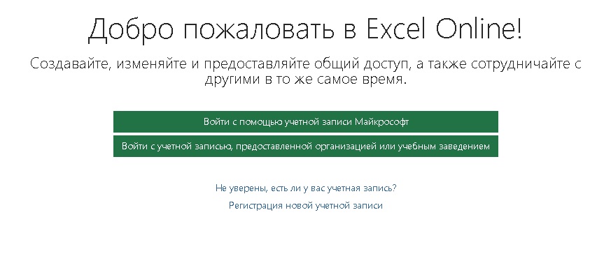 Першою відмінністю є те, що для роботи з онлайн-версією Excel користувач повинен авторизуватися в системі Microsoft. Якщо у вас немає особистого облікового запису, то її можна легко створити просто пройшовши реєстрацію. Для цього натисніть на кнопку Реєстрація облікового запису на сторінці привітання.