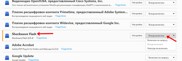 У списку знайдіть плагін Flash і навпроти нього з випадаючого меню виберіть «включати».