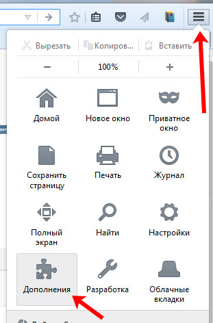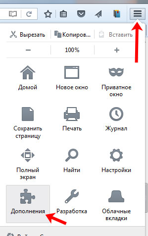 Переглянути встановлену версію плагіна можна і через браузер. Натисніть на кнопку у правому верхньому кутку у вигляді трьох горизонтальних прямих і виберіть зі списку «Доповнення».