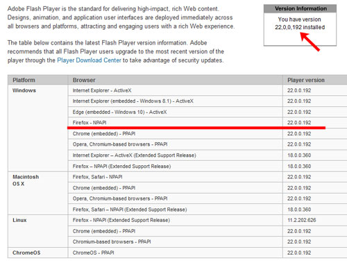 Для цього перейдіть на офіційний сайт Adobe сторінку, де наведена таблиця з номерами останніх версій плагіна для різних операційних систем і браузерів.