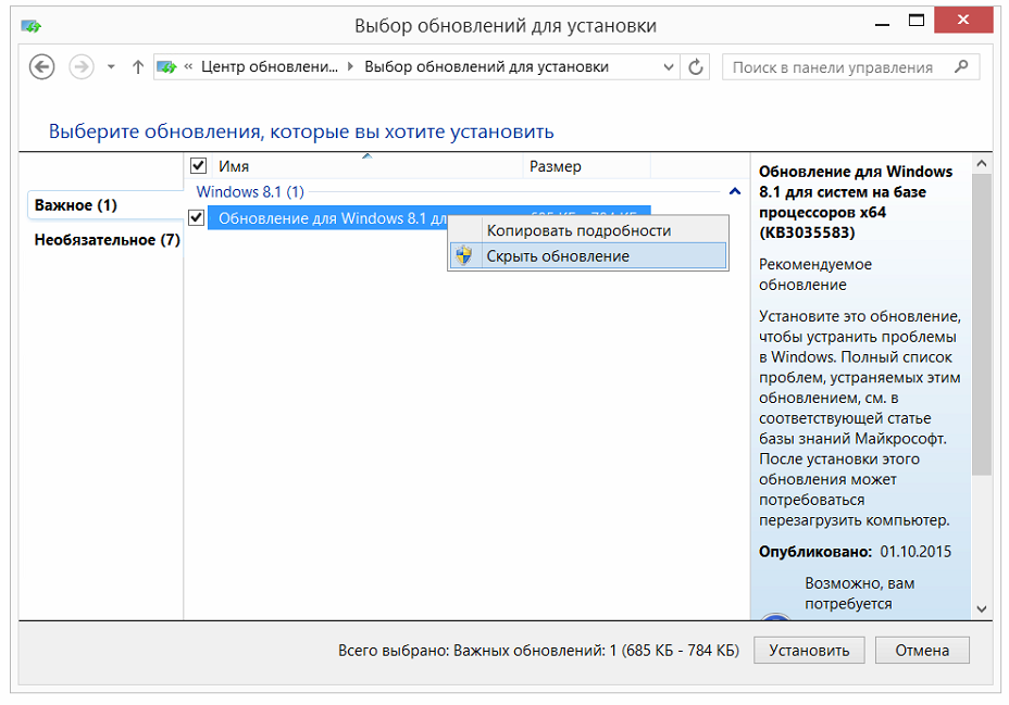 - Коли пошук знайде потрібне оновлення, треба клікнути на ньому пр. кнопкою мишки і вибрати рядок «Приховати оновлення».