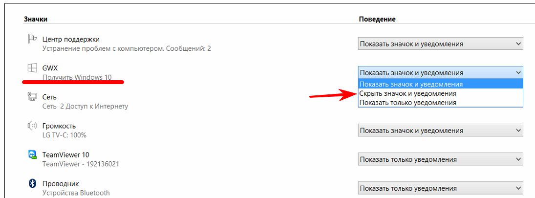 - У вікні знаходимо додаток GWX і натискаємо на кнопку поруч з ним. В меню, яке повинне з’явитися, вибираємо пункт «Приховати значок і попередження».