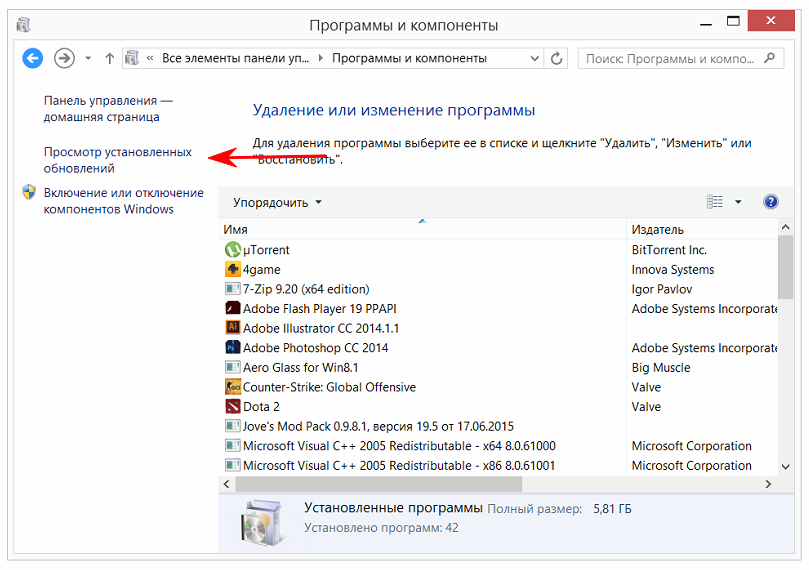 - Вибираємо підрозділ «Програми та компоненти», а там потрібно клікнути по ссилочку «Перегляд інстальованих оновлень».
